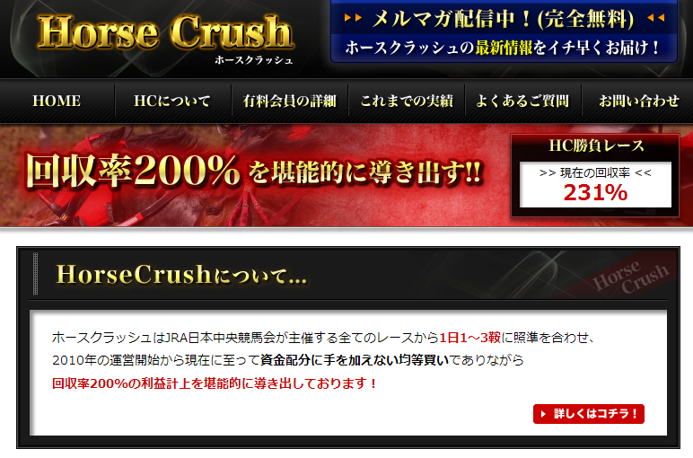ホースクラッシュはJRA日本中央競馬会が主催する全てのレースから1日1~3鞍に照準を合わせ、 2010年の運営開始から現在に至って資金配分に手を加えない均等買いでありながら 回収率200%の利益計上を堪能的に導き出しております!